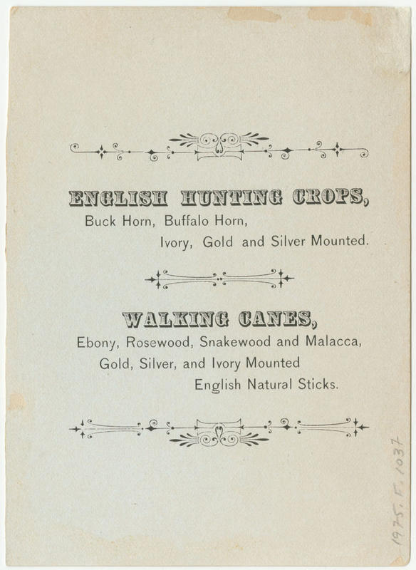 Advertising text promoting Glendinning & Truitt's English hunting crops, walking canes, driving whips, and riding whips printed on versos.