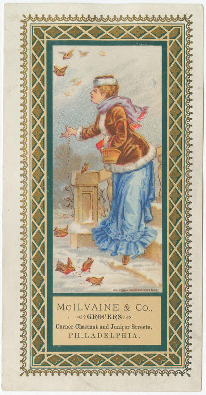 Series of illustrated trade cards for McIlvaine & Co., grocers, at Juniper and Chestnut Streets in Philadelphia. Illustrations depict various birds, flowers and women outside feeding birds, picking flowers, and sitting near the ocean.