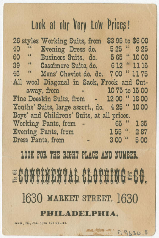 Advertising text printed on versos promotes the Old Continental Clothing Manufacturing Company's low prices and includes price lists.