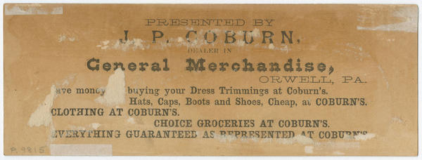 One print [P. 9815] contains distributor's imprint printed on verso: Presented by J.P. Coburn, dealer in general merchandise, Orwell, Pa. Save money buying your dress trimmings at Coburn's. Hats, caps, boots and shoes, cheap at Coburn's. Clothing at Coburn's. Choice groceries at Corburn's. Everything guaranteed as represented at Coburn's.