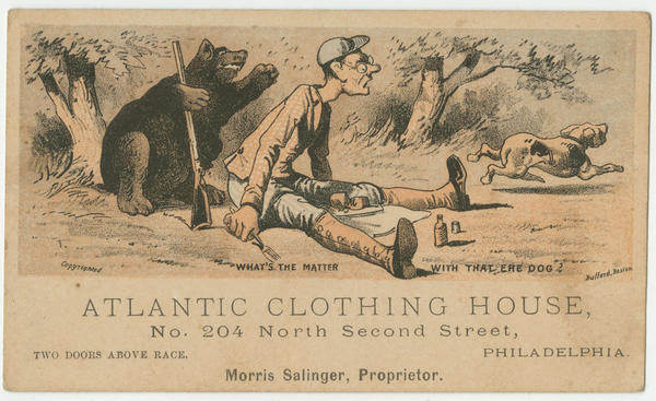 Advertising text printed on recto for Atlantic Clothing House, No. 204 North Second Street, Philadelphia, two doors above Race. Morris Salinger, proprietor.