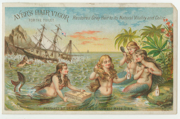 Series of illustrated trade cards for patent medicines and an almanac created by Dr. J.C. Ayer & Co. in Lowell, Massachusetts. Illustrations depict sirens with an "Ayer's hair vigor" shipping crate, hair brushes, and product bottles near a wrecked ship and stranded sailors; a girl holding flowers under a cherry tree in the countryside; Penn's Treaty with the Indians in 1682 with two men kneeling and presenting an "Ayer's cherry pectoral" scroll to the Native Americans; and two men and an apprentice with a printing press in a scene labeled "The invention of printing". J.C. Ayer & Co. operated in Lowell, Massachusetts from about 1850 to 1930.