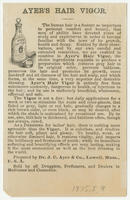 Three prints [1975.F.2; 1975.F.9; 1975.F.11a] contain advertising text on versos for products prepared by J.C. Ayer & Co. including "Ayer's hair vigor" and "Ayer's cherry pectoral".
