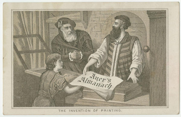 Series of illustrated trade cards for patent medicines and an almanac created by Dr. J.C. Ayer & Co. in Lowell, Massachusetts. Illustrations depict sirens with an "Ayer's hair vigor" shipping crate, hair brushes, and product bottles near a wrecked ship and stranded sailors; a girl holding flowers under a cherry tree in the countryside; Penn's Treaty with the Indians in 1682 with two men kneeling and presenting an "Ayer's cherry pectoral" scroll to the Native Americans; and two men and an apprentice with a printing press in a scene labeled "The invention of printing". J.C. Ayer & Co. operated in Lowell, Massachusetts from about 1850 to 1930.