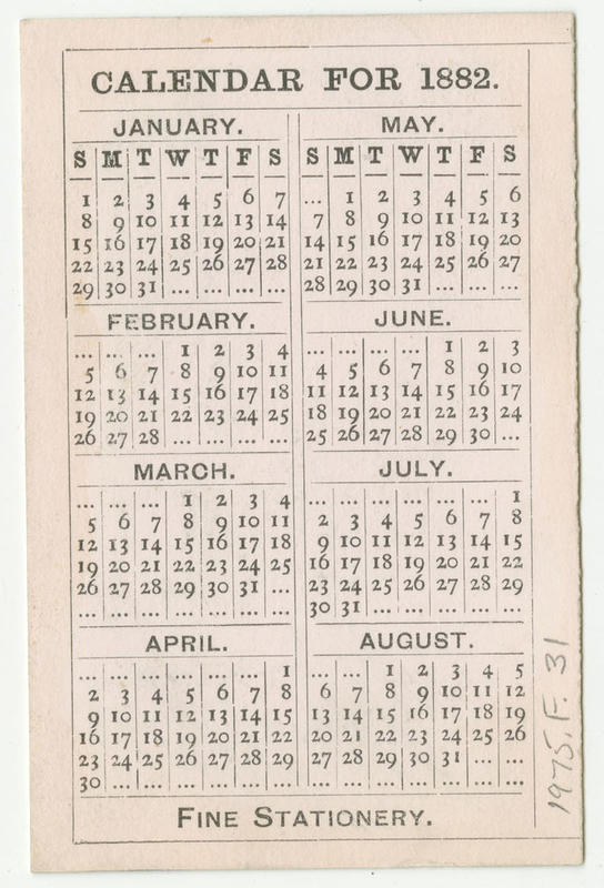 Three prints [1975.F.50, 1975.F.52, 1975.F.162] contain advertising text on rectos or versos for the Stationery Department of Bailey, Banks & Biddle. Stationery items "made expressly to order by Messrs. Goodall & Son, London". Two prints [1975.F.50; 1975.F.31] contain calendars on versos.