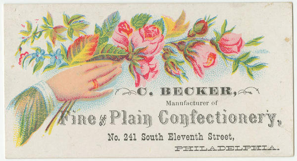 Illustrated trade cards depicting women's hands holding bunches of flowers. German-native Christian Becker started his confectionery business in Philadelphia circa 1875.