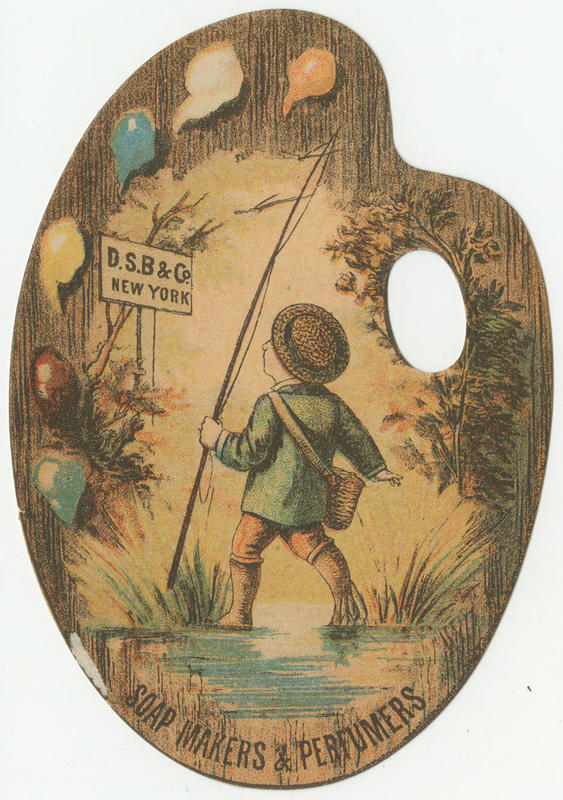 Die cut trade card shaped into a painting palette with an illustration in the center depicting a boy wearing a straw hat and shoulder bag with a fishing rod in his left hand. He wades through a pond or lake toward a signboard reading "D.S.B & Co. New York".