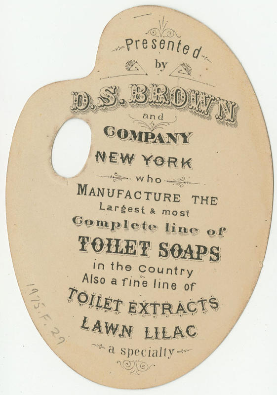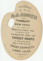 Advertising text printed on verso: Presented by D.S. Brown and Company New York who manufacture the largest & most complete line of toilet soaps in the country. Also a fine line of toilet extracts. Lawn lilac a specialty.