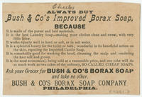 Contains advertising text printed on verso: Always buy Bush & Co's improved borax soap, because it is made of the purest and best materials. It is the best laundry soap--making your clothes clean and sweet, with very little labor. It works equally well in hard or soft, or in salt water. It is a splendid luxury for the toilet or bath; wonderful in its beneficial action on the skin, equaling the imported castile soap. It is remarkably good for washing the head, cleansing the scalp and rendering the hair soft and glossy. It is the most economical, being sold at a reasonable price, and one cake will do as much work as two cakes of the ordinary, so-called cheap soaps. Ask your grocer for Bush & Co.'s borax soap and take no other.
