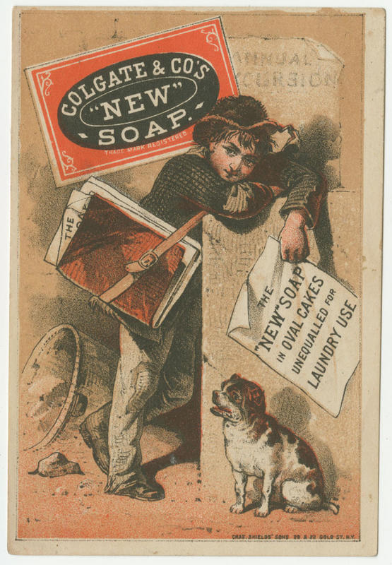 Illustrated trade card depicting a newsboy, with a bag of newspapers slung over his shoulder and a paper advertising "new" soap in his left hand, standing and leaning against a wall on the sidewalk. A dog sits at his feet. A broadside for Colgate & Co.'s "New" soap hangs on the wall behind him. William Colgate founded the company as William Colgate & Company in New York City in 1806. Upon his death in 1857, the style changed to Colgate & Company.