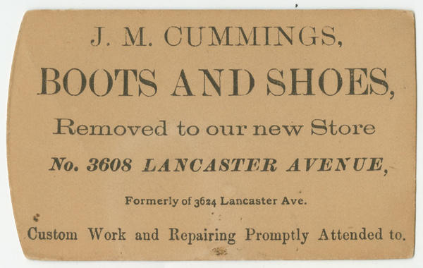 J. M. Cummings, boots and shoes, removed to our new store, No. 3608 Lancaster Avenue, formerly of 3624 Lancaster Ave. [graphic] : Custom work and repairing promptly attended to.