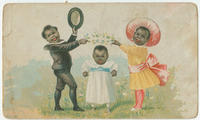 Racist trade card promoting Eagle Starch Enamel Manufacturing Co. and depicting three smiling African American children, portrayed in caricature. In the center, the toddler stands attired in a white dress with a large collar and blue sash, white stockings, and tan shoes. Flanking the toddler, the boy, attired white shirt with a large circular collar, a black jacket, black breeches, stockings, and shoes, and the girl, attired in a pink, brimmed hat, a yellow, long-sleeved dress with a pink sash, pink stockings, and white shoes, hold a wreath of leaves over the toddler’s head.