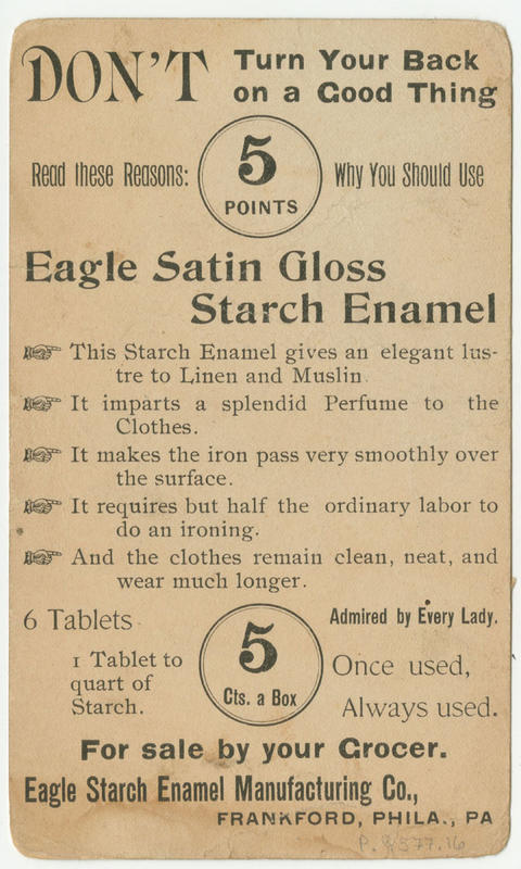 Contains advertising text printed on verso listing five reasons to use eagle satin gloss starch enamel.