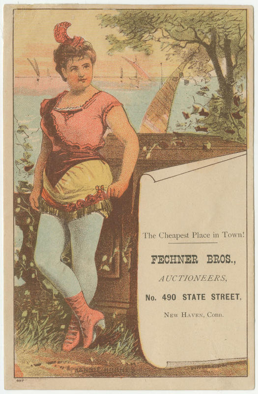 Series of illustrated stock trade cards for New Haven auctioneers Fechner Bros. depicting portraits of famous nineteenth-century actresses and dancers, including Eliza Weathersby, Jennie Hughes, Carrie Perkins, and Arline Stanley, posed in landscape settings in costume.