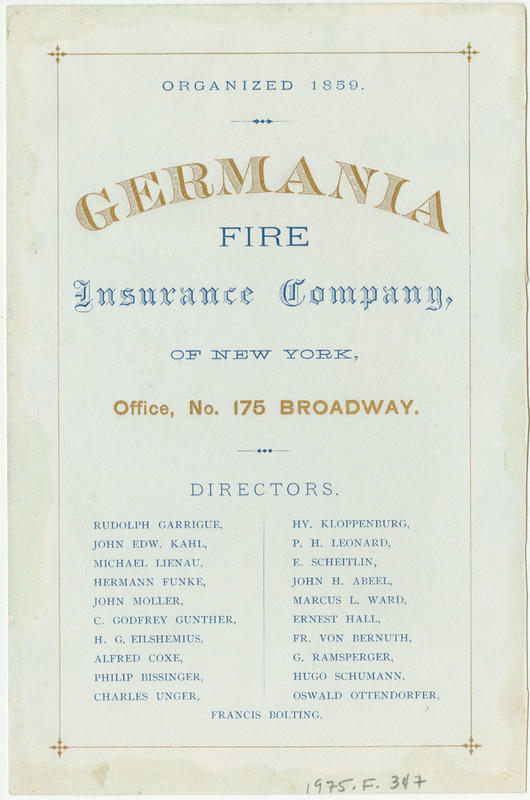 Text, including list of twenty-one directors, printed on verso: Organized 1859. Germania Fire Insurance Company, of New York, office, No. 175 Broadway.