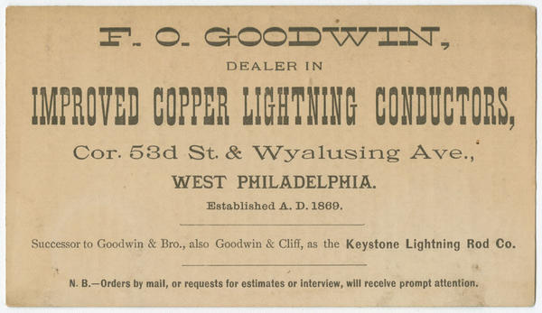F.O. Goodwin, dealers in improved copper lightning conductors, cor. 53d St. & Wyalusing Ave., West Philadelphia. [graphic] : Established A.D. 1869. Successor to Goodwin & Bro., also Goodwin & Cliff, as the Keystone Lightning Rod Co. N.B.--Orders by mail, or requests for estimates or interview, will receive prompt attention.