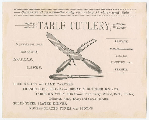 Advertising text printed on versos promotes products manufactured, imported and repaired by Charles Herder at 830 Arch Street in Philadelphia, including roller skates, ice skates, shears and scissors, razors, table cutlery, pocket cutlery, and carving and pen knives. The business of Charles Herder began in 1847 as Clarenbach & Herder, changed to L. Herder & Son in 1871 and by 1879, the style changed to Charles Herder.