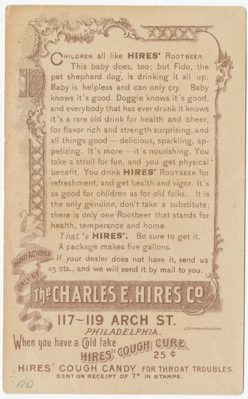 Advertising text promoting Hires rootbeer for good health and Hires cough cure for instant relief printed on versos. One print [P.9651.11] also includes testimonials for Hires root beer from customers printed on verso.