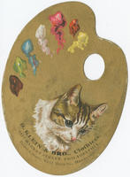 Illustrated trade card die cut and shaped into an art palette depicting a cat. D. Klein & Bro. was a partnership between David and Lewis Klein.