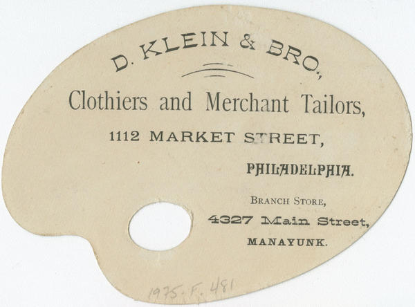 Advertising text printed on verso: D. Klein & Bro., clothiers and merchant tailors, 1112 Market Street, Philadelphia. Branch store, 4327 Main Street, Manayunk.