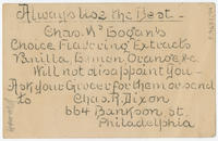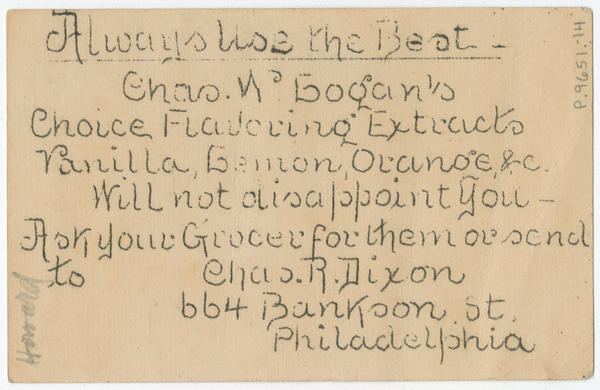 Advertising text printed on verso: Always use the best. Chas. W. Logan's choice flavoring extracts. Vanilla, lemon, orange,