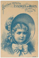 Advertising text promoting essences of meat (beef, mutton, and chicken) for invalids, dyspeptics, infants, in cases of sea sickness and after child-birth printed on verso with the London Manufacturing Company's trademark symbol.
