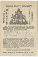 Advertising text promoting essences of meat (beef, mutton, and chicken) for invalids, dyspeptics, infants, in cases of sea sickness and after child-birth printed on verso with the London Manufacturing Company's trademark symbol.