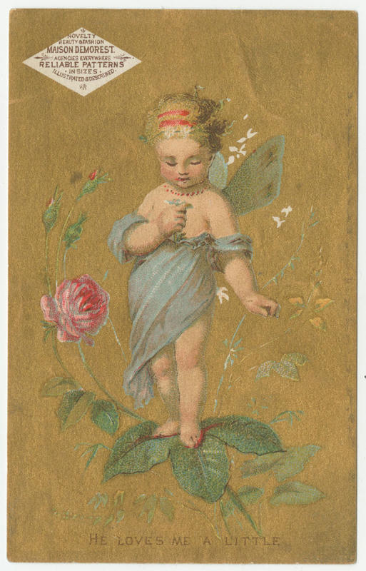 Illustrated trade card depicting a winged cherub attired in a sheer robe standing on the leaves of a rose branch pulling the