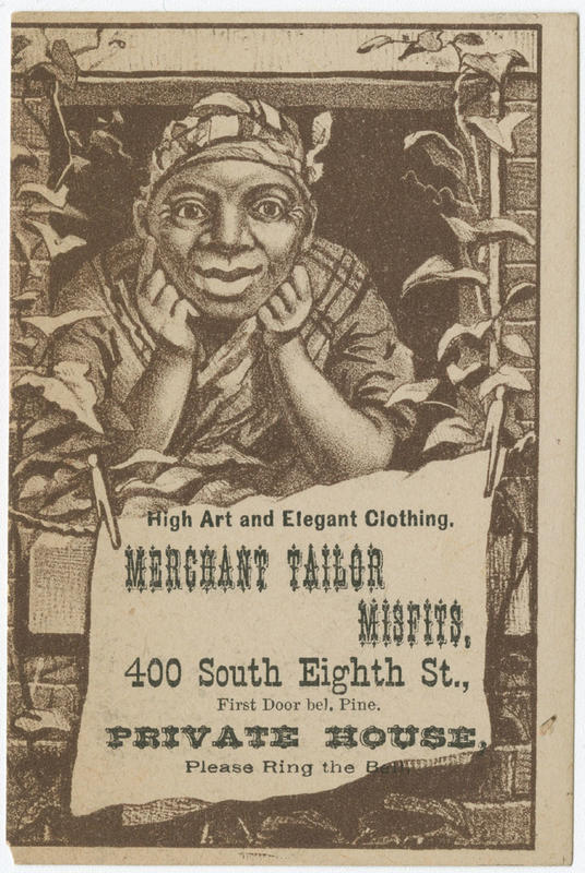 Series of racist trade cards promoting a Philadelphia clothing store and depicting African American women. An African American woman, portrayed in racist caricature and attired in a striped head kerchief, a checked shawl, and a dress with the sleeves rolled up to her elbows, cradles her head in her hands as she leans on the windowsill of an open window and looks at the viewer. Other card depicts an African American woman nanny, portrayed in racist caricature and attired in a head kerchief, a striped dress with the sleeves rolled to her elbows, and a checked apron, who smiles and stands behind a picket fence holding a white infant at her side.