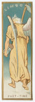Illustrations entitled "Past-time" on versos depict the back of an elderly winged figure of Death walking away from the viewer under the word "limbo". He holds a scythe in his right hand and an hourglass in his left hand.