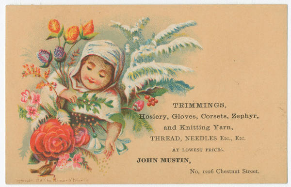Advertising text printed on versos: Established 1815. Mustin's original trimming store, the largest [Philadelphia,] wholesale hosiery, glove, trimming, zephyr worsted, knitting yarn, and thread & needle establishment, No. 515 Arch Street, and No. 510 Cherry Street, where storekeepers only, are supplied. Retail store, 1226 Chestnut Street.
