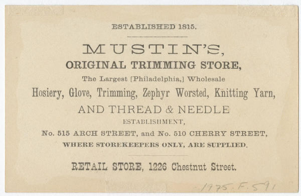 Advertising text printed on versos: Established 1815. Mustin's original trimming store, the largest [Philadelphia,] wholesale hosiery, glove, trimming, zephyr worsted, knitting yarn, and thread & needle establishment, No. 515 Arch Street, and No. 510 Cherry Street, where storekeepers only, are supplied. Retail store, 1226 Chestnut Street.