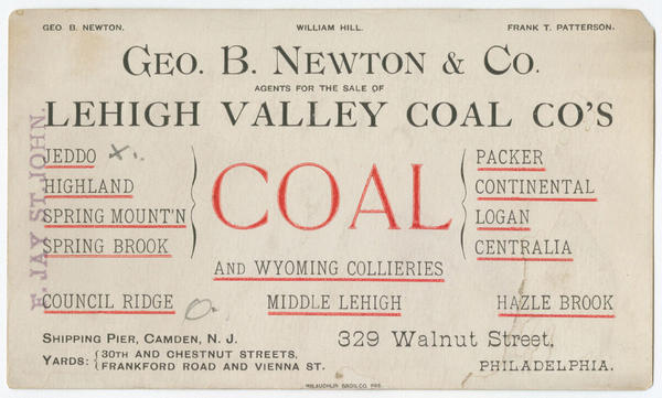 George B. Newton & Co., agents for the sale of Lehigh Valley Coal Co.'s coal. 329 Walnut Street, Philadelphia. [graphic] : Shipping pier, Camden, N.J. yards: 30th and Chestnut Streets, Frankford Road and Vienna St. ; Geo. B Newton. William Hill. Frank T. Patterson.