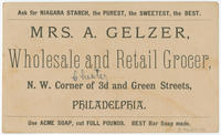 Distributor's imprint printed on verso: Mrs. A. Gelzer, wholesale and retail grocer, N.W. corner of 3d and Green Streets, Philadelphia. Manuscript note above address: Chester. Refers most likely to Loretta Gelzer, wife of Peter Gelzer, who operated a grocery store at 600 North Third Street in Philadelphia.