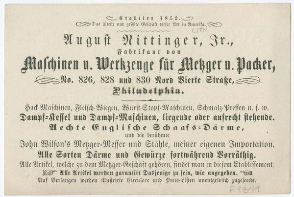 August Nittinger, Jr., manufacturer of butchers' & packers' machinery and tools, nos. 826, 828 & 830 North Fourth Street, Philadelphia. [graphic] : Established 1852. The oldest and largest establishment of the kind in the United States. Meat chopping machines, meat rockers, sausage stuffing machines, lard presses &c. Boilers & engines, horizontal or vertical. Importer of genuine English sheep casings, and the celebrates John Wilson's butchers' knives & steels. Depot for the sale of all kinds of casings and spices. Everything in the butchers' and packers' line can be had at this establishment. All goods warranted as represented. Illustrated catalogue & price list sent free upon application.