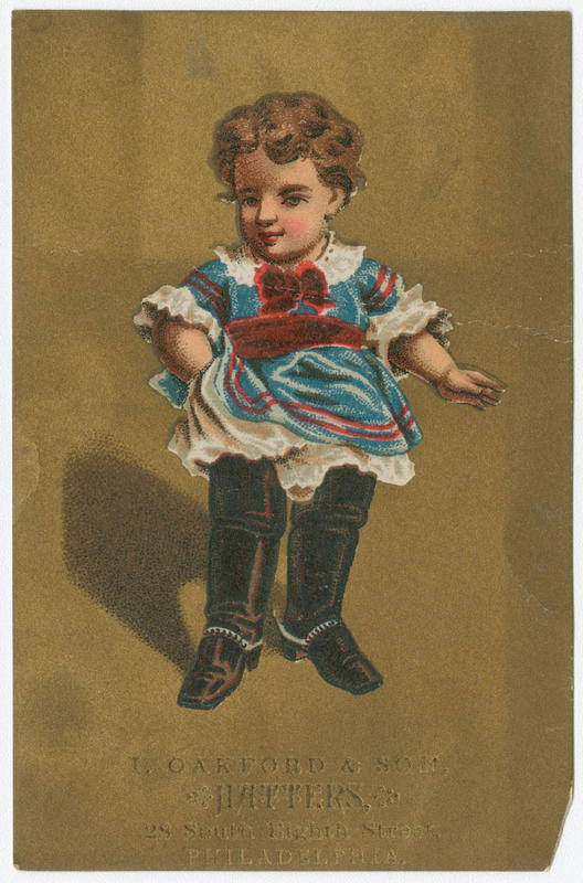 Illustrated trade card depicting a full-length portrait of a young girl wearing boots too large for her body. I. Oakford & Son was the partnership between Isaac Oakford and his son Charles E. Oakford.