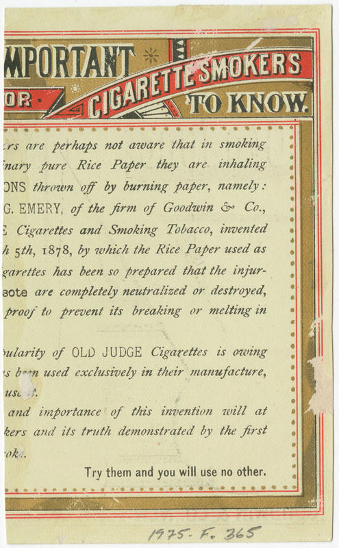 Advertising text printed on verso entitled, "Important for cigarette smokers to know," promotes the rice paper (patented in 1878) used in "Old Judge" cigarettes produced by Goodwin & Co.