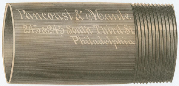 Trade card die cut and shaped into a pipe thread. Pancoast & Maule was formed by Henry B. Pancoast and Francis I. Maule in Philadelphia.