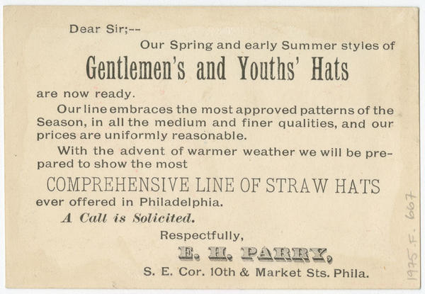 Advertising text printed on verso promotes gentlemen's and youths' hats and a comprehensive line of straw hats for sale at E.H. Parry's store.
