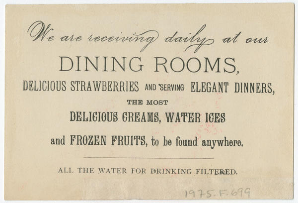 Advertising text printed on versos promotes the cafe and dining rooms and lists specific products served including Christmas cakes, ice creams, water-ices, frozen fruits, oysters, roast turkey, chicken, beef, lamb, veal, coffee, tea, chocolate, strawberries and strawberry cream.