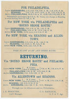 Time tables for trains bound to Philadelphia and New York, including the "Bound Brook Route", printed on verso. Signed J.E. Wootten, gen'l manager and C.G. Hancock, G.P. & T. agt.