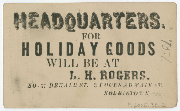 Advertising text printed on verso: Headquarters for holiday goods will be at L.H. Rogers, no. 17 DeKalb St., 3 doors ab. Main St., Norristown, Pa.