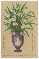 Illustrated trade card depicting a bouquet of flowers in a decorative urn adorned by a mythological female figure holding a shield and spear.