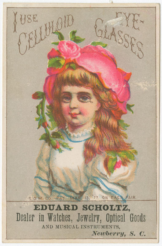 I use celluloid eye glasses. S.O.M. Co. pat. Mar. 13, '77 on each pair. [graphic] : Eduard Scholtz, dealer in watches, jewelry, optical goods and musical instruments, Newberry, S.C.