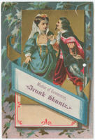 Illustrated trade card depicting a couple attired in fancy dress for a ceremony.
