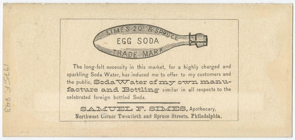 Advertising text printed on versos promotes Simes' apothecary at the northwest corner of Twentieth and Spruce Streets in Philadelphia and some of his products, including Cryoline (a silver polish), egg soda, and ginger ale.