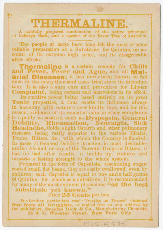 Advertising text printed on verso promotes Thermaline as a remedy for chills and fever, fever and ague, all malarial diseases, liver complaint, dyspepsia, general debility, rheumatism, neuralgia, sick headache, colds, slight catarrh and other pulmonary diseases.