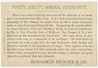 Advertising text printed on versos promotes the purity, quality and general superiority of the soap produced by Benjamin Brooke & Co. with the expertise of Mr. A. Van Haagen, formerly of McKeone, Van Haagen & Co.