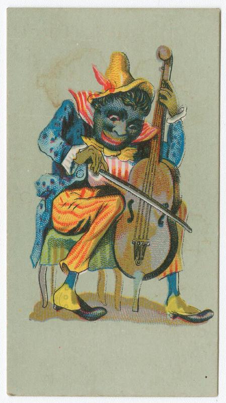 Racist trade card depicting an African American man, portrayed in caricature with an oversized head and exaggerated facial features, sitting on a chair and playing the cello. He is attired in bright, mismatched clothing, including a yellow hat, a red and white striped and collared shirt, a yellow bowtie, a blue jacket with tails, yellow and red striped pants, blue socks, and yellow and black shoes. Includes vignettes of a boot and a shoe printed on verso.