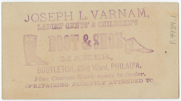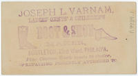 Joseph L. Varnam, ladies' and gents' & children's boot & shoe maker, Bustleton, 23rd ward, Philad'a. [graphic] : Fine custom work made to order. Repairing promptly attended to.